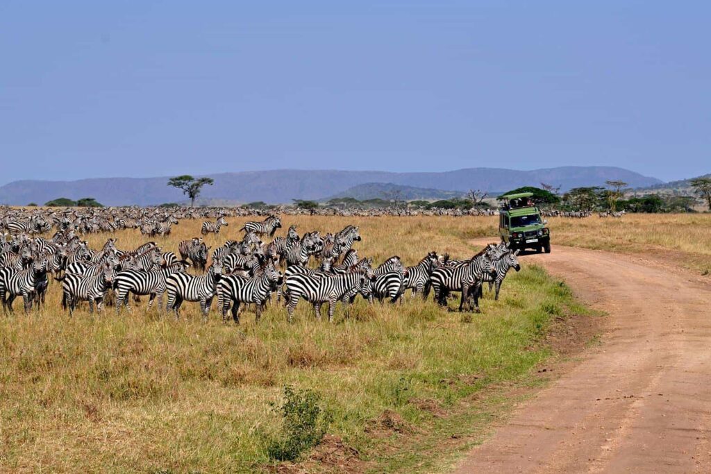 Após o safári, retorno ao lodge para o almoço e, em seguida, início da viagem terrestre rumo a Karatu. O trajeto percorre o Parque Nacional do Serengeti e a Área de Conservação de Ngorongoro, em um percurso de aproximadamente três a quatro horas. Ao longo do caminho, a paisagem se transforma: vastas planícies cedem lugar a colinas ondulantes, campos cultivados e vegetação exuberante, compondo um cenário que traduz a riqueza natural da Tanzânia.